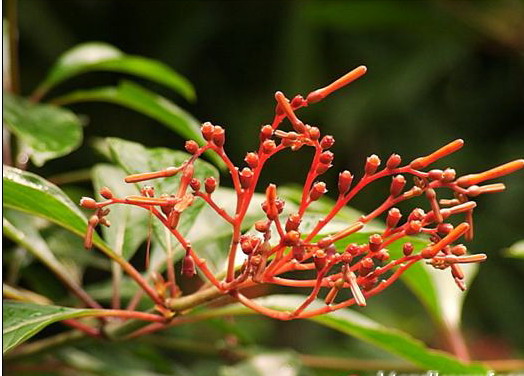花頂生,為聚傘型圓錐花序,管狀花長2.5厘米,橘紅色。正常花期為5至10月,溫度適宜時,可全年開花。