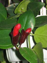 毛萼口紅花(Aeschynanthus lobbianus):莖紫褐色。葉卵圓形對生,墨綠色富有光澤,葉片邊緣紫色。花萼筒狀,被有白色絨毛,花筒狀,鮮紅色,花冠上有乳白色條紋。