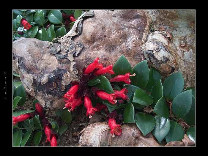 細萼口紅花(Aeschynanthus micranthus):葉色翠綠有光澤,花深紅色筒狀。