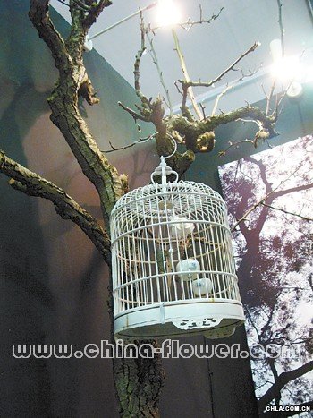 林惠理的作品展示區(qū),以《黑與白的聯(lián)想》為命題。設(shè)計(jì)成的以黑白色為基礎(chǔ)色的亭院一角,桃樹上懸掛著白色的鳥籠,搭配深色的樹枝,顯得韻味十足。