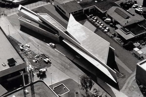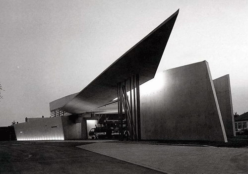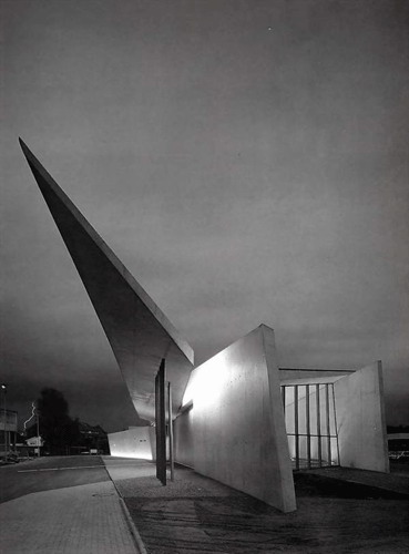 扎哈的作品在具有非凡的創(chuàng)造力和力度之外,也極具女性的想象力。看到扎哈的設(shè)計圖,大多數(shù)人都會認為那是一種繪畫,那像爆炸一樣抽象的畫面只是畫而已,要實施簡直是天方夜談。(圖9)而在1993年,扎哈有機會完成了她的建筑處女作??德國巴伊爾。阿姆。萊茵的世界家具商維特拉公司的“消防站”的設(shè)計。這件很小的作品立刻轟動建筑界,成為當(dāng)代建筑的經(jīng)典作。(圖10、11、12)