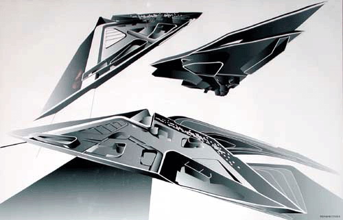 除了很少的幾個實施方案之外,她更多的是末付諸實現(xiàn)的紙上建筑,在那些更為抽象、也更為自由的空間里,她的奇思怪想發(fā)揮得更為淋漓盡致。(圖13、14)我曾經(jīng)看過她的一張設(shè)計圖,以黑色為重色的圖中,門和窗似乎都獨立出來了,平面和線條仿佛都在空中飛行。有人這么評價她:“這個黑頭發(fā)的伊拉克女人似乎根本不是為地球上的建筑而設(shè)計,她的設(shè)計思想和建筑精神都沖破了地心吸力而進入了第三維空間”。這和她自己的說法恰巧吻合。她說:過去我認定有無重力的物體存在,而現(xiàn)在我已經(jīng)可以確信建筑就是無重力的,是可以飄浮的。