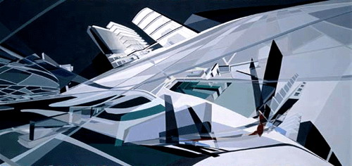 方案中的建筑物面向場地中的大道,進入大門200-300m,就可看到右手邊銳利的刀刃狀的長而薄的房檐,這就是扎哈常常描繪的“建筑的碎片”。沿著路,整個建筑的造型低低長長的延伸下去,卻并不是單一的正方體的延伸,而是3個相似三角形的銳角并排重疊在一起,象一個緩緩下行的樂章,里面充滿了強烈的流動感和速度感。
