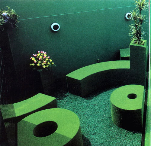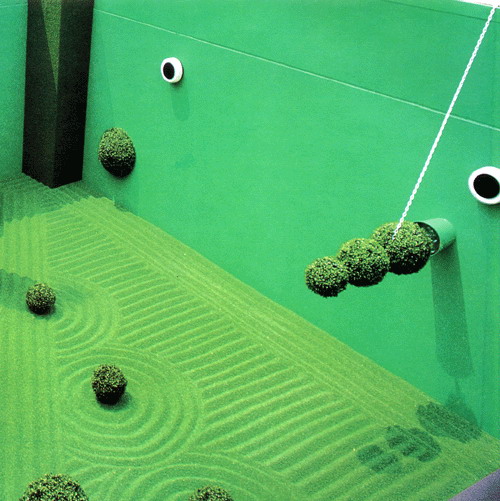 在“懷特海德學(xué)院拼合園”中,她將日本庭園與法國園林拼合在一起,所有的植物都用塑料代替,沙子完全涂成綠色。完全是一個“后現(xiàn)代拼貼”式的怪胎。(圖21、22)
