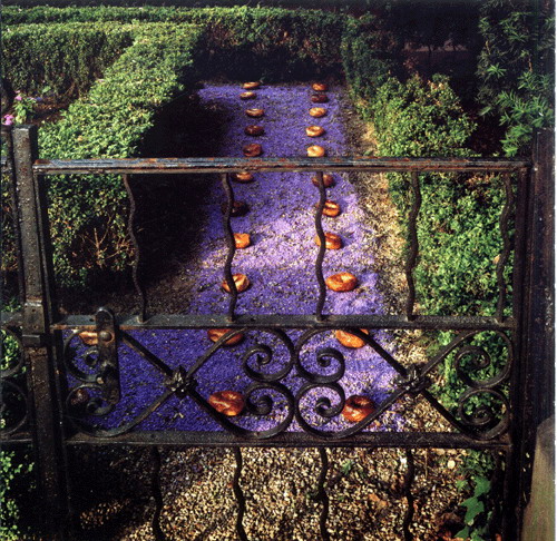 在表達思想和對現(xiàn)實的關(guān)注的同時,她的設(shè)計也是感性可愛的,流露出對生活的熱情。比如她曾經(jīng)為慶祝她的丈夫出差一周返回而布置了一個面包圈花園。在黃楊籬方塊之間,舒爾茲布置了一條紫色的卵石帶,上面網(wǎng)格狀的放了72個經(jīng)過防腐處理的面包圈。用明媚的色彩和生活化的材料創(chuàng)造了洋逸著小女人情懷的庭園。雖然這個有趣的設(shè)計并沒有維持幾天,不久就被貓破壞了,但是它卻成為了舒爾茲的代表作之一。(圖23)