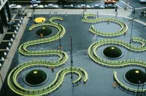 舒爾茲對景觀的色彩運用有獨特的見解,她說:“我們漸漸長大,學(xué)會了什么叫有品位,什么是他人能接受的。我們學(xué)會了不再為花哨的,鮮艷的,眩目的這些我們小時候偏愛的色彩而激動。我很排斥有關(guān)格調(diào)問題的所有論點。'品位'是一套支配人們觀看,行動和感覺方式的法則。同樣我們的文化對色彩的看法是病態(tài)的。”因此她的作品永遠是鮮艷眩目的,充滿色彩的。(圖24、25)
