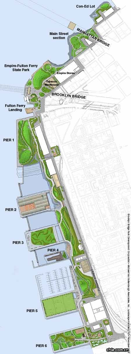 布魯克林大橋公園由著名的景觀建筑設計師Michael Van Valkenburgh主持設計,建成后將為布魯克林和紐約的市民提供綜合的休閑設施以及更多的開放性空間。公園橫貫曼哈頓大橋和大西洋道,將6個廢棄的工業碼頭改建成綿延起伏的小山、市民廣場和自行車道、人造沼澤地、足球場、曲棍球場、壘球運動場、橄欖球場、籃球場、手球場、排球場、冰上曲棍球場、乒乓球場、開放式草坪等等。設計師大膽地在水面上建起一個長4英里的木板橋,人們可以近距離的接近河水,并沿著碼頭設計了浮道以供市民觀賞風景。計劃還包括一幢共有710個單位的住宅樓,一個酒店以及餐廳。