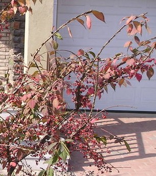 衛矛科,灌木或小喬木,原產地株高可達8m,園林栽植一般株高2-3m。葉橢圓形,具鋸齒,聚傘花序,花小,果粉紅色,假種皮橘紅色。秋葉鮮紅色,適宜于綠地及公園,是非常好的觀秋葉樹種。