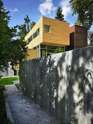 這個規劃必需容納一家六口,并作為娛樂和展示逐漸成長的當代藝術的收藏的一個平臺。容納家庭和藝術的雙重需要使“被服務”和“服務”的概念成為了為房屋設計的有組織的工具。功能的分區也允許藝術和孩子并肩生活,并因彼此而更加富足。房屋有四個截然不同的部分組成:玻璃圍繞的主樓生活區,木頭包裹的上部臥室層,鋼鐵鎧裝的延伸到背面的“服務”區域,以及一間懸臂的灰泥覆蓋的辦公室。房屋的基礎概念是一條可延伸房屋長度的直線的,充滿光線的走廊。這片空間在所有的樓層中把“被服務”從“服務”的功能中分離出來,包括平面的和縱切面的。