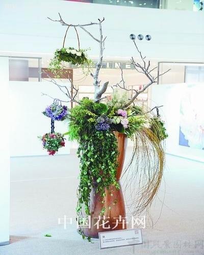 花藝展的十幾個作品的花材全部由荷蘭進口,僅成本就達數(shù)萬元。樓梯口處幾米高、以滿天星點綴黃色馬蹄蓮的巨龍造型頗有氣勢,表達出盛世騰飛的主題;展示臺上,以枯藤、綠色繡球以及鐵線蕨等創(chuàng)作的一組自然風情作品,散發(fā)出原野般清新的氣息;以藤編酒瓶狀造型三個一組創(chuàng)作的大型落地作品,簡單地點綴以蘭花,意在表達人與人之間和諧親切的情感。此外,各具特色的新娘捧花作品點綴其間,多姿多彩。花藝師舉辦了小型花藝表演。花藝展配合畫展,在溫馨的燈光、小提琴醉人的伴奏中,讓所有觀眾重新認識了花的魅力。商場不少高端品牌的負責人在現(xiàn)場討論著哪些作品可以用在什么樣的活動中。
