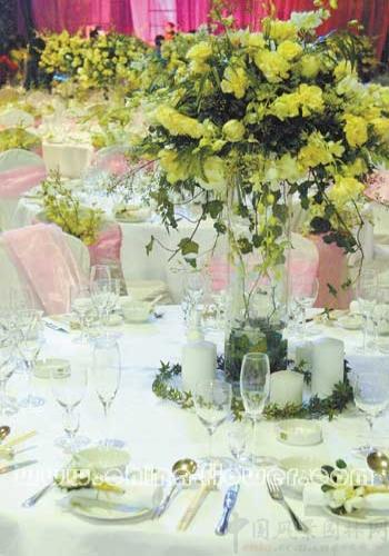 首先,對于花飾色彩的選取和搭配,應先決定用什么風格的花,這通常取決于婚禮的風格。現代風格的婚禮可以擺上裝飾有玫瑰和草木的枝狀大燭臺;鄉村風格的婚禮則最好將花放入瓷器花瓶中。