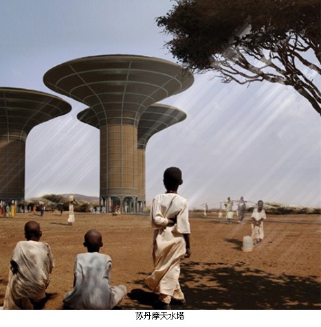 在面積廣闊的蘇丹沙漠,淡水成為最寶貴的資源之一,獲取淡水的難度超乎人們想象。有意思的是,沙漠地下深處也隱藏著世界上最大的地下湖,如果能夠有效加以利用,當地居民的生活便會發生翻天覆地的變化。波蘭建筑事務所H3AR提出了一種解決之道,即建造外形好似當地猴面包樹的水塔群并利用地下泵抽水。水塔內建有一個水處理廠、一所醫院、一所學校以及一個食物儲藏中心。