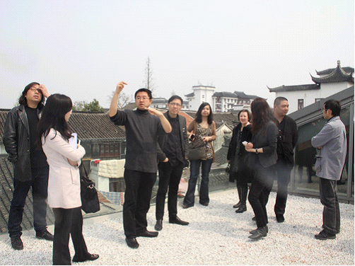 在建筑師祝曉峰的帶領(lǐng)下,張斌、李翔寧、劉宇揚(yáng)、莊慎、王方戟、彭禮孝、彭怒等建筑師嘉賓一同參觀了新建成的"朱家角古鎮(zhèn)人文藝術(shù)館"。主創(chuàng)設(shè)計(jì)師祝曉峰就其作品為大家進(jìn)行了詳細(xì)的講解。