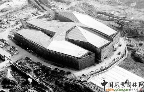 位于錦繡湖畔的自然館就是一座巨大的植物溫室,主要展示世界上不同地域、不同氣候帶的珍稀植物及生態景觀。自然館建筑本身半埋地下,立面材料選用玻璃、木材與少量混凝土結合,保證整個館內有充足的光照。自然館倚山而建,層層疊疊,與地形完美結合,從高度上、視覺上弱化了建筑的體量,保證在建筑內部也可以從不同角度領略錦繡湖面和更遠處各個展園的美景。