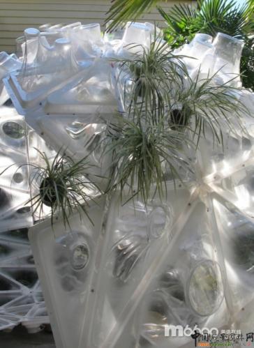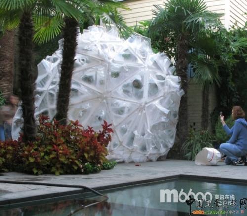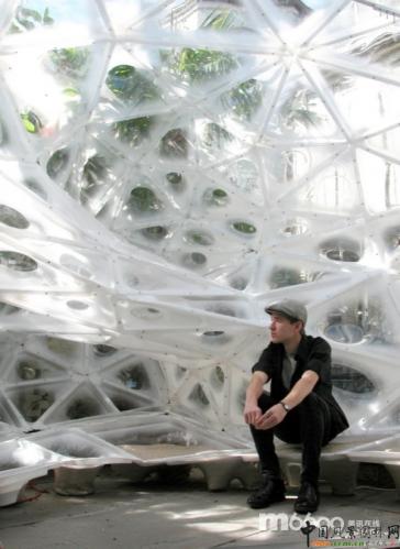 這個亭子位于一個美麗的當?shù)禺嬂鹊暮笤骸Mぷ诱嫉?8平方米,含有320個不同的PETG單元格。這些單元格都是半成品,它們在一起合成了6個巨大的促成部分,這樣的設計便于在小型卡車中運輸,也便于Riether和他的8個學生在兩天內(nèi)安裝完成。