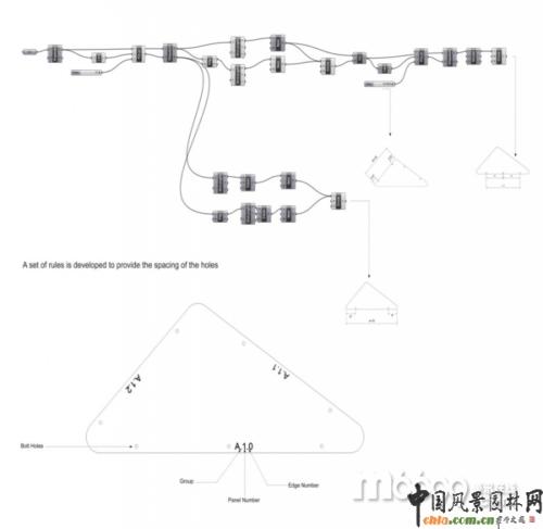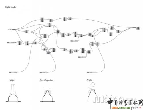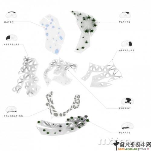 亭子呈幾何結(jié)構彎曲,這樣便于適應周圍環(huán)境,吸收太陽能以及亭子的建筑要求,比如照明、座位、視野、景觀和水收獲系統(tǒng)。每個單元格都有特定的建筑規(guī)則。