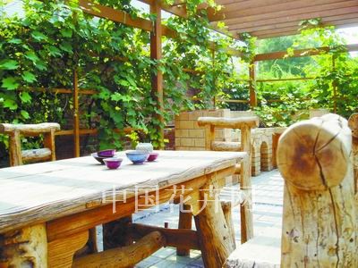 棕紅色的L型防腐木花架下,是一家人以及親朋好友聚餐閑聊的專享區。用干枯、古老的木樁、木板加工而成的餐桌和座椅將滄桑、懷舊的韻味充分演繹。透過那一道道干裂的木紋,一片片泛著棕黃的印跡,你會情不自禁聯想到它們曾經默默度過了無數個風吹雨打的日夜,最終成就了如今的“金剛不壞”之身。再經過能工巧匠的打造,成為將中式自然風與西式造型完美結合的花園家具。天氣晴好的日子,擺上一桌子的美味佳肴,邀上三五好友,一邊大快朵頤,一邊暢談逸聞趣事,好不快活。