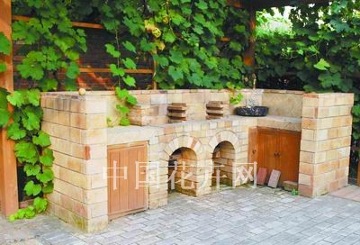 燒烤臺是近幾年頗受歐式花園愛好者熱捧的物件兒,操作臺、洗手盆、儲物柜、爐膛……但凡烹飪工作需要的設備都能匯集在這個設備里。你可以根據自己的喜好決定燒烤臺的規格和組成構件,只要自己用的舒服就好。淺橙黃色的耐火磚在色調上與不遠處的木制桌椅相呼應,讓花架燒烤區成為一個穩定的整體。