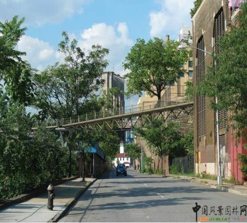布魯克林高架是從布魯克林高速路走到Squibb公園之前的通道。Squibb公園這個小花園就像一個新的橋梁并連接新的河畔公園。最初的方案提倡直線陡峭步行通道連接兩個街區。但是Zoli看見一個機遇,就是一個隱藏在BQE和Furman街下面廢棄的小塊綠地。設計師提出設計一條蜿蜒的步行小徑,使游客可以更好的接觸自然,探尋自然的秘密。在到達下一個街口Furman街的拐彎處留下足跡,體驗不一樣的步行感覺。拐彎設置向北急轉彎斜坡把途人融入迷人景觀和公園之中。這個特別的轉彎有400英尺長,32英尺高,斜坡坡度為5%。就算是坐輪椅的途人也能夠輕松的上斜坡。