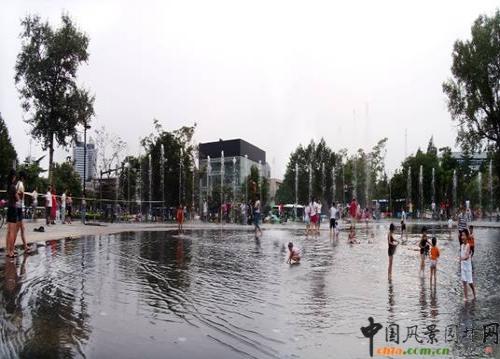 西南門廣場西側安裝一座音樂噴泉,噴泉東側是三個中間低、四周高的水膜廣場,水膜厚度0-20厘米,廣場的南北兩側是疏林草地,在炎炎的夏季,噴泉各種各樣的水柱伴隨著美妙的音樂翩翩起舞,兒童在水膜中戲水玩耍,游人在水膜廣場周圍欣賞著噴泉和周圍的美景,一幅歡快、祥和的景象展現在游人面前。
