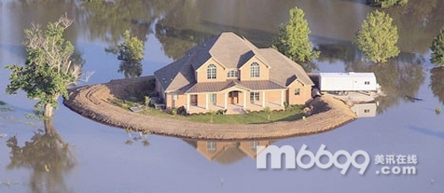 小島之家理念上認為住在海濱區(qū)總比屋子里浸滿水要好,面對密西西比河小支流泛濫的洪水,理智的居民都是這種感覺。于是他們就將住宅周圍筑起了高高的大壩,用來保護他們的家不受漲潮的危害。