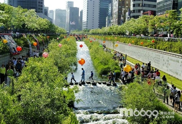 這條溪流從深埋于首爾市的地下,發現之后,將其改造成了一個蔥綠的公園,即清溪川河岸工程。這個長5.6千米的公園是眾多活動的聚集地,也是市民娛樂的主要場所,同時也是眾多昆蟲、魚類和野生動物的棲息地。