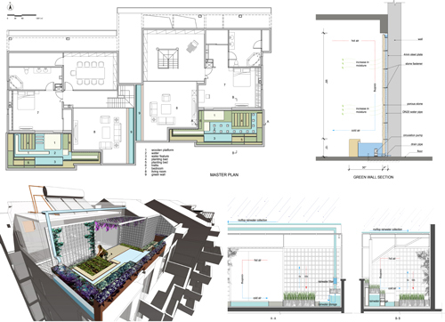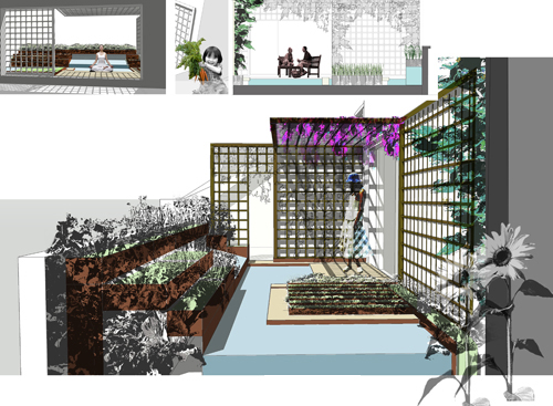 由于北京較惡劣的氣候時間很長,兩個主要臥室外的陽臺得不到高效使用。改造設(shè)計是將它們轉(zhuǎn)化為溫室花園,一個是服務于廚房的生產(chǎn)性蔬菜園,另一個是為主臥室準備的可食用芬芳花園。溫室罩面用玻璃和遮陽格柵結(jié)合而構(gòu)成,以便控制光線進入強度,設(shè)計可以手動開啟的窗戶,使小氣候得以方便進行地人工調(diào)控;在屋頂安裝太陽能光熱板,收集的太陽輻射提供家庭廚房及洗浴需要的熱水。這兩個花園的平面布局和空間結(jié)構(gòu)完全相同,由中間的水池和汀步構(gòu)成的花園,允許人們到達每一個角落。一個木質(zhì)平臺漂浮于水面上,從臥室中伸展出來,可以成為納涼和晨練的場所,業(yè)主甚至可將它作為可以仰觀星星的另一臥床。種植槽由鋼板制成,呈臺地式布置四周,這樣為種植區(qū)節(jié)省了空間,也使得植物能夠充分接受陽光。種植槽內(nèi)以適合場地的尺寸靈活劃分,槽內(nèi)放置可拆卸的種植箱,又便于后期的清理維護。臺地狀的種植槽底部預留儲水箱,用來儲存從屋頂收集的雨水。這些雨水可以用來灌溉花園中植物,同時,水體具有蓄熱功能,可緩解冬季的嚴寒和夏季的炎熱。輕質(zhì)多孔的上水石堆積起來,同樣可以調(diào)節(jié)濕度和溫度,還為苔蘚類植物提供了生長的空間。面向花園的臥室外墻面和溫室頂部由木格柵構(gòu)建,木格柵采用3cmx3cm木條以20cmx20cm間距排布,以便垂直綠化,使空間的尺度和質(zhì)感更加宜人,并調(diào)節(jié)作用進入溫室內(nèi)的光線。