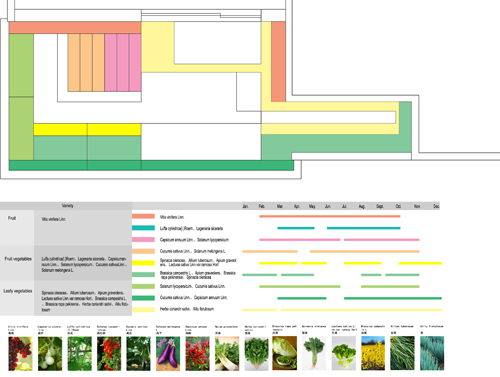 盡管布局相同,但兩個陽臺花園選用植物材料完全不同。在蔬菜園中,通過對種植槽中不同蔬菜的色彩、高度、形態(tài)、習性的選取,制定了四季可以輪作的種植方案:花園春季可以采收香菜、油菜,夏季可以品嘗番茄、黃瓜,秋季可以收獲葫蘆、葡萄,冬季可以樂享生菜、辣椒。這些蔬菜的產(chǎn)量相當可觀(見表1),主人可以每天享受一盤沙拉,以及一些豆類和水果等。