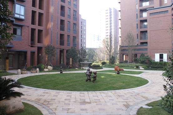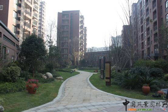 自然流暢的園路將綠地根據住戶的行走方便劃分開來,綠化疏密有致,形成"疏可跑馬,密不透風"的綠化景觀,草坪開闊處適當點綴瓦罐組合,使綠地看起來更加生動、活潑。