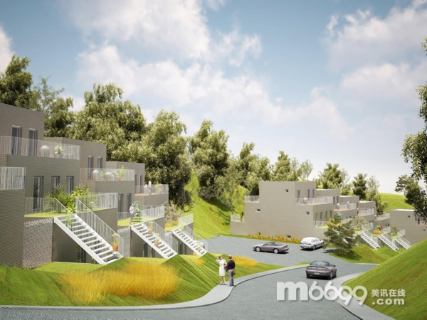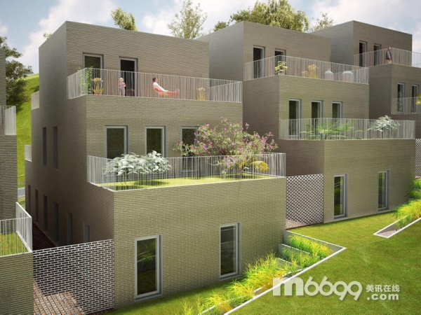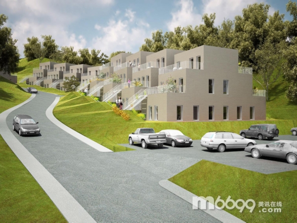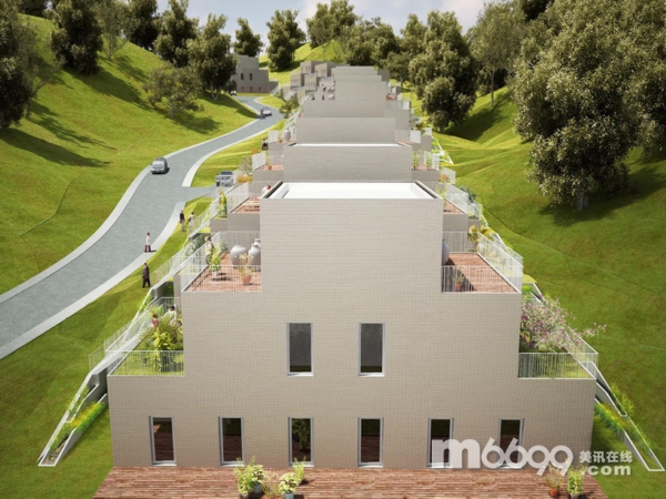 住宅的設(shè)計(jì)方案是建造一個(gè)重復(fù)的二層單元建筑,每?jī)蓚€(gè)單元相互堆疊:?jiǎn)螌悠椒浇ㄔ诘谝粚樱庸⒉贾迷陧敳俊?個(gè)單元建筑為一組,每組建筑群都以階梯式序列排布。