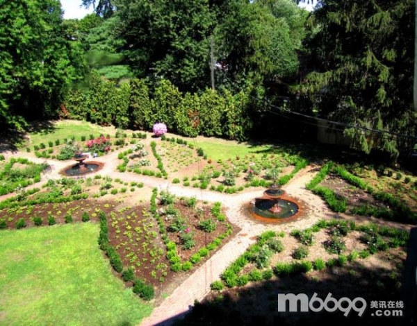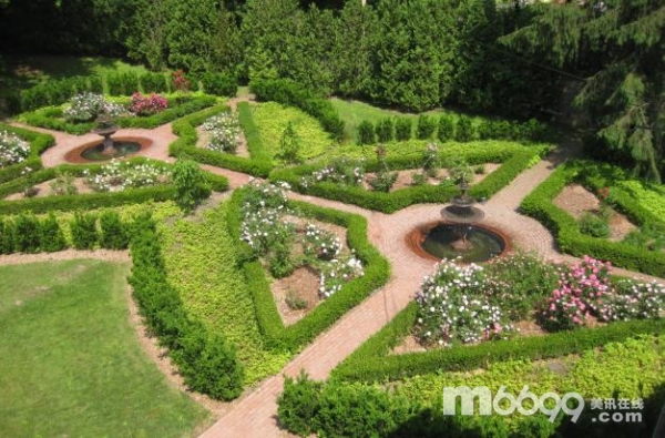 Kevin Lee Jacobs的朋友Roderic Blackburn為他構思了這個花園的設計:兩個50英尺的大圓形交叉在一起,磚石小路穿插在花園之中。兩個圓圈內分別有四個六角形的玫瑰苗圃,苗圃邊緣種植著黃楊木。圓圈的正中間有一個三層的雕塑噴泉。