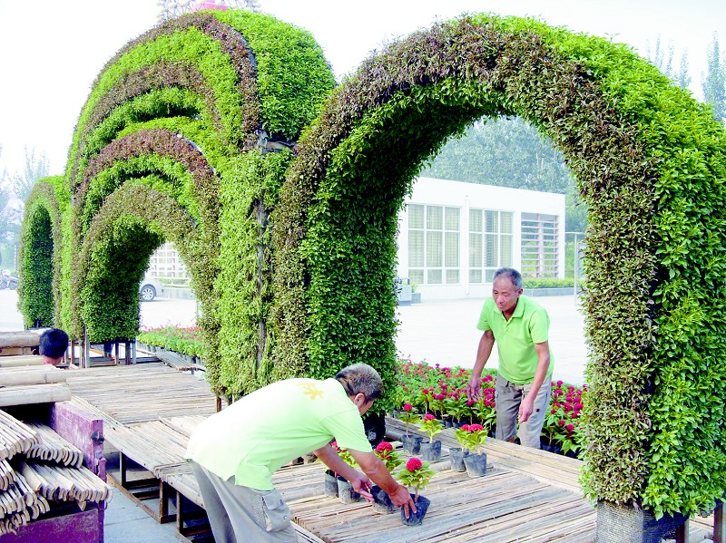 8月29日,菏澤開(kāi)發(fā)區(qū)園林工人在市區(qū)擺放鮮花。為迎接中秋節(jié)、國(guó)慶節(jié)及林交會(huì),市城市管理局近日開(kāi)始在市中華路、天香路和人民路等市區(qū)主要路段節(jié)點(diǎn)及公園門(mén)口擺放26處造型花卉,共用花卉近10萬(wàn)盆(株)。花卉造型有花塔、轉(zhuǎn)動(dòng)花架、植物雕塑、紅旗雕塑、蝴蝶雕塑、景墻雕塑等十余種。