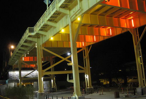 為了營造一個(gè)溫馨的的城市居住空間,燈光工程公司為座位區(qū)、人行道和廣場設(shè)計(jì)了照明燈景。對(duì)于這個(gè)空間的“天花板”,鐵橋下方加強(qiáng)了浮動(dòng)效果的投光燈,勾勒和照亮了I型表面和鉚釘紋理。紅色和金色的雙色配色方案與淡黃色的油漆涂料搭配和諧。