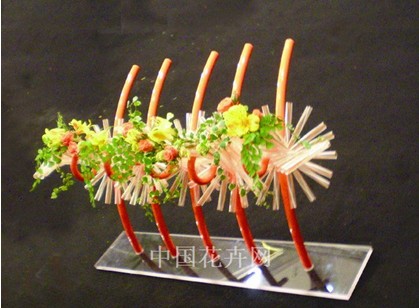 五個桔黃色的"一字"架豎直站立在透明的有機板上(打孔嵌入并用膠粘固),塑料吸管擰成螺旋狀纏繞在掛勾與"一字"的相交處。就是這樣一個簡單的架構,裝飾上黃色的小花及綠色的葉材,是不是很像一排芭蕾舞演員,整齊化一地踢出修長的腿,伸展腰肢在翩翩起舞呢!