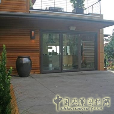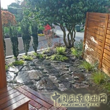 這個小的庭院邊上的平臺通過應用對比明顯的材質使庭院顯得更加豐富活潑,包括巖石板、木制板和松柏綠籬。在平臺下面還種植有鈍齒冬青和均等間距的日本冬青。