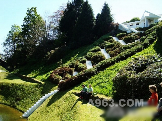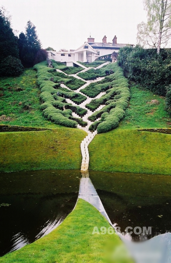 蘇格蘭西南部,有一個(gè)花園叫做“Garden of Cosmic Speculation”,里面的景觀設(shè)計(jì)全部按照各種數(shù)學(xué)與科學(xué)圖形進(jìn)行設(shè)計(jì)規(guī)劃,如分形,螺旋,黑洞……花園內(nèi)植物不是很茂密,甚至有些空曠之感,但根據(jù)數(shù)學(xué)公式,曲線等制作出的地形地貌成為花園最奇特的地方。其中后花園的大臺(tái)階最具戲劇性,也最吸引人。