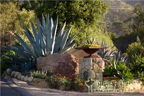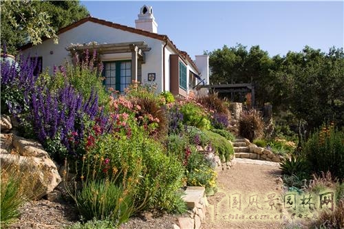 中國(guó)風(fēng)景園林網(wǎng)訊 這個(gè)生機(jī)勃勃的庭院令人難以置信的是四年前這里曾是一塊光禿禿的、被燒焦的山坡。在2008年11月,美國(guó)加利福尼亞州圣巴巴拉市發(fā)生的一起大火蔓延了整座山,而這個(gè)住宅就在這座山上。然而房子保留了下來(lái),而其周圍的庭園被徹底燒毀了,戶主也因此一直在考慮他們是留是走。Grace設(shè)計(jì)事務(wù)所的Enter Margie Grace是一位女景觀設(shè)計(jì)師,在這個(gè)項(xiàng)目的改建中,她考慮了很多關(guān)于保護(hù)景觀的設(shè)計(jì)。通過(guò)設(shè)計(jì)一個(gè)美麗的防火景區(qū)為戶主提供一個(gè)安心消遣的住宅地,從而提升了戶主的精神情緒。