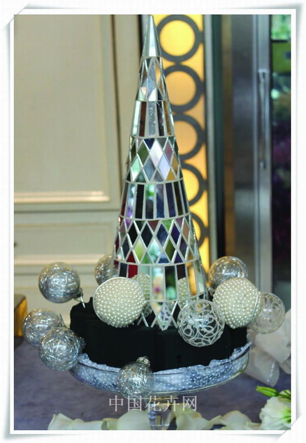 第一步:將鏡面圣誕柱擺在圓盤花泥正中,并放穩(wěn)。