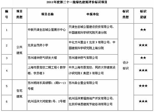 關(guān)于2011年度第二十一批綠色建筑評(píng)價(jià)標(biāo)識(shí)項(xiàng)目的公示