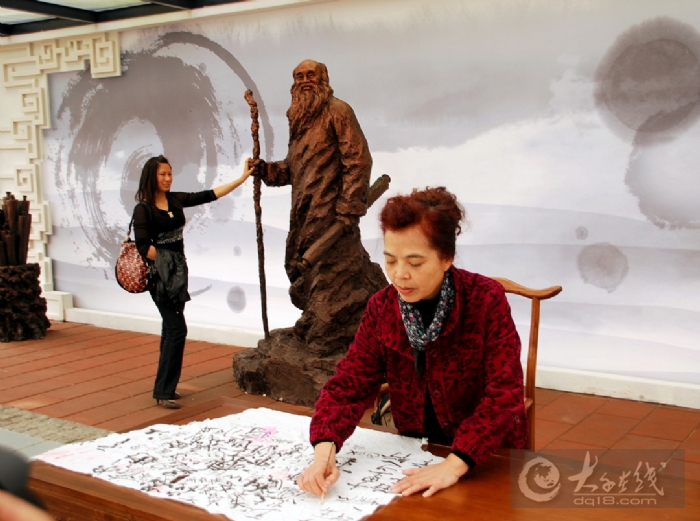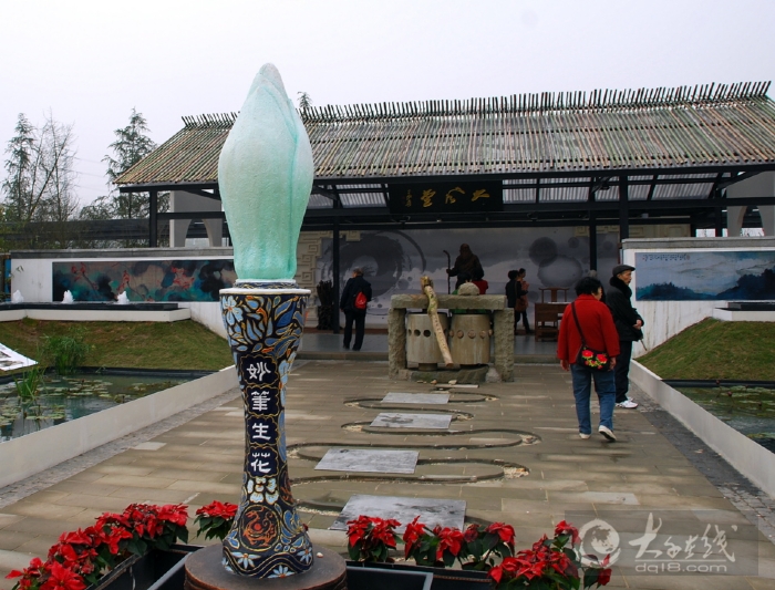 在張大千畫像側旁擺有一張書桌,上面放著宣紙筆墨,游人可以在此練筆、體驗大千故里、文化內江的韻味