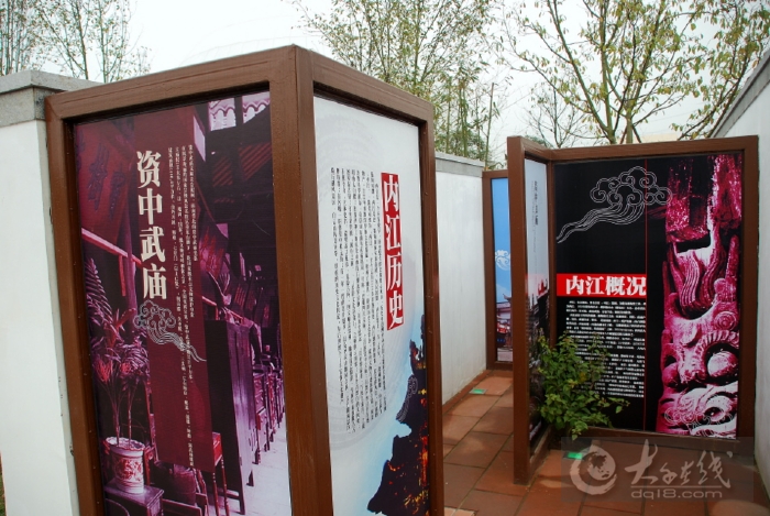 用玻璃和木板分隔的曲形走廊以及一幅幅介紹內江文化風情的圖片都很新穎別致
