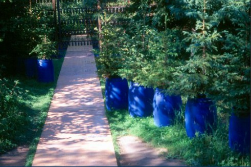 五名年輕的景觀設計師,都來自于魁北克的大森林中,在劍橋工作,他們為游客帶來的是一場現代林地的充滿趣味的審美體驗。他們在空地上開始建花園,在杉樹外面加上木桶,排布成線性小徑,十字交叉的塑料片構成的血管懸掛在升起的鐵架結構,在這里面裝滿了林森容器。這是工業化的“植物”嗎,大眾消費遺傳概念或是文化展示?當人們試圖定義當代林業時,所有這一切問題都會讓人思考起來。