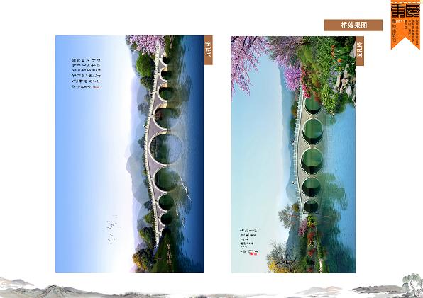 在景觀結構上結合現狀"山擁水環"的景觀氣勢,規劃營造"一軸多帶"景觀結構,山擁為眾星拱月之勢,水環為平湖映翠之景,一軸為啟承轉合之序,多帶為層疊輾轉之韻。在景點分布上結合園博園群山環繞之形,營造園博園十大景點,分別為臥龍石刻、廊橋飛瀑、雙亭瀑布、瞑閣暮鐘、重云繞塔、沐風幽廊、梅苑山莊、龍景書院、青山茅廬、千里云頂。