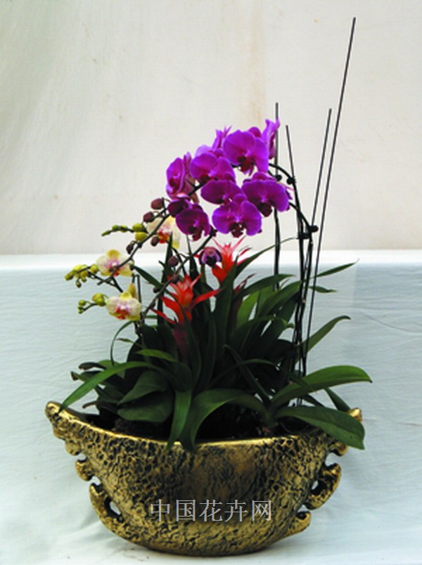 第三步:植入兩株淡色迷你蝴蝶蘭,同樣方法固定,使其與大花蝴蝶蘭相呼應(yīng)。