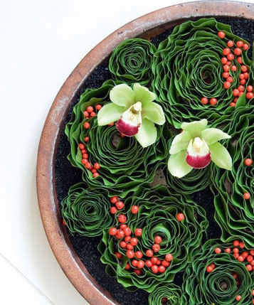 氛圍:山葵葉天然的波浪邊緣,逐圈圍合在一起可以輕松做出花瓣造型,紅豆和蕙蘭是細節(jié)上的巧思,我們可以叫它夢中睡蓮。因為適合俯視觀賞,適合擺放在餐桌或客廳的茶幾前,都不會阻礙人們的視線,影響交談。