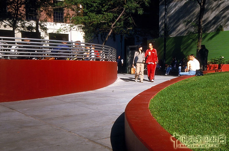 公園的外圍是有獨特色彩的帶狀墻和和雕刻成細管組的墻,減弱了城市網格狀結構。角落的咖啡座可以同時觀看公園和路邊活動。