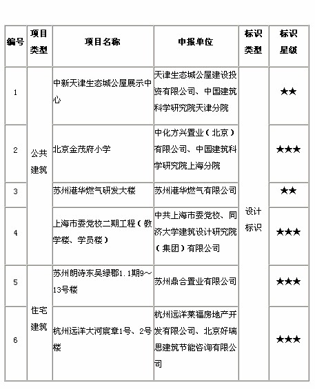 根據(jù)《綠色建筑評價標(biāo)識管理辦法》(建科[2007]206號)、《綠色建筑評價標(biāo)準(zhǔn)》(GB/T50378-2006)、《綠色建筑評價技術(shù)細(xì)則》(建科[2007]205號)和《綠色建筑評價技術(shù)細(xì)則補(bǔ)充說明(規(guī)劃設(shè)計部分)》(建科[2008]113號),我部組織開展了2011年度第二十一批綠色建筑評價標(biāo)識項目評價工作。經(jīng)審定,中新天津生態(tài)城公屋展示中心等6個項目獲得綠色建筑評價標(biāo)識。