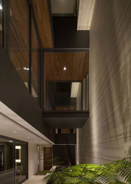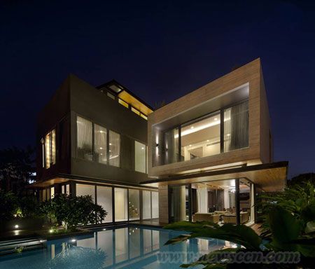 西側厚重的石灰石墻和大塊的垂檐減少了下午陽光的直射。入口處、起居空間和臥室縱向排列,有助于自然交叉通風和光照的進入。為了盡可能利用土地,四層樓的房屋有一層是位于地下的。花園和水景遍布于房屋四處,底層的起居間和餐廳則面朝泳池和一座魚塘。
