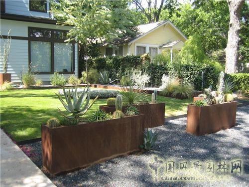 現代景觀的標志之一是整齊的網格式地被,這樣可以在通常鋪設水泥的地方同時整齊地鋪裝草坪和石子,或者是水泥鋪設在不同主題表現的植物景觀間。當然,網格式的設計不是表現現代花園的唯一方式。景觀設計師建議對植物的應用可以像對盆器物的應用那樣靈活。