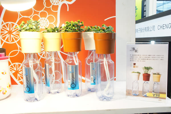 一般植物的栽培都需要經(jīng)常進行澆水灌溉,但在文博會上記者看到一款小創(chuàng)意產(chǎn)品,通過灌好水的小瓶子和鏈接水瓶與盆栽底部的棉簽裝置進行潤土作用,起到灌溉的效果。這種小創(chuàng)意產(chǎn)品生產(chǎn)成本和售價都不高,可謂經(jīng)濟又環(huán)保,十分時候經(jīng)常出差無法天天照顧到小植物的人士使用。